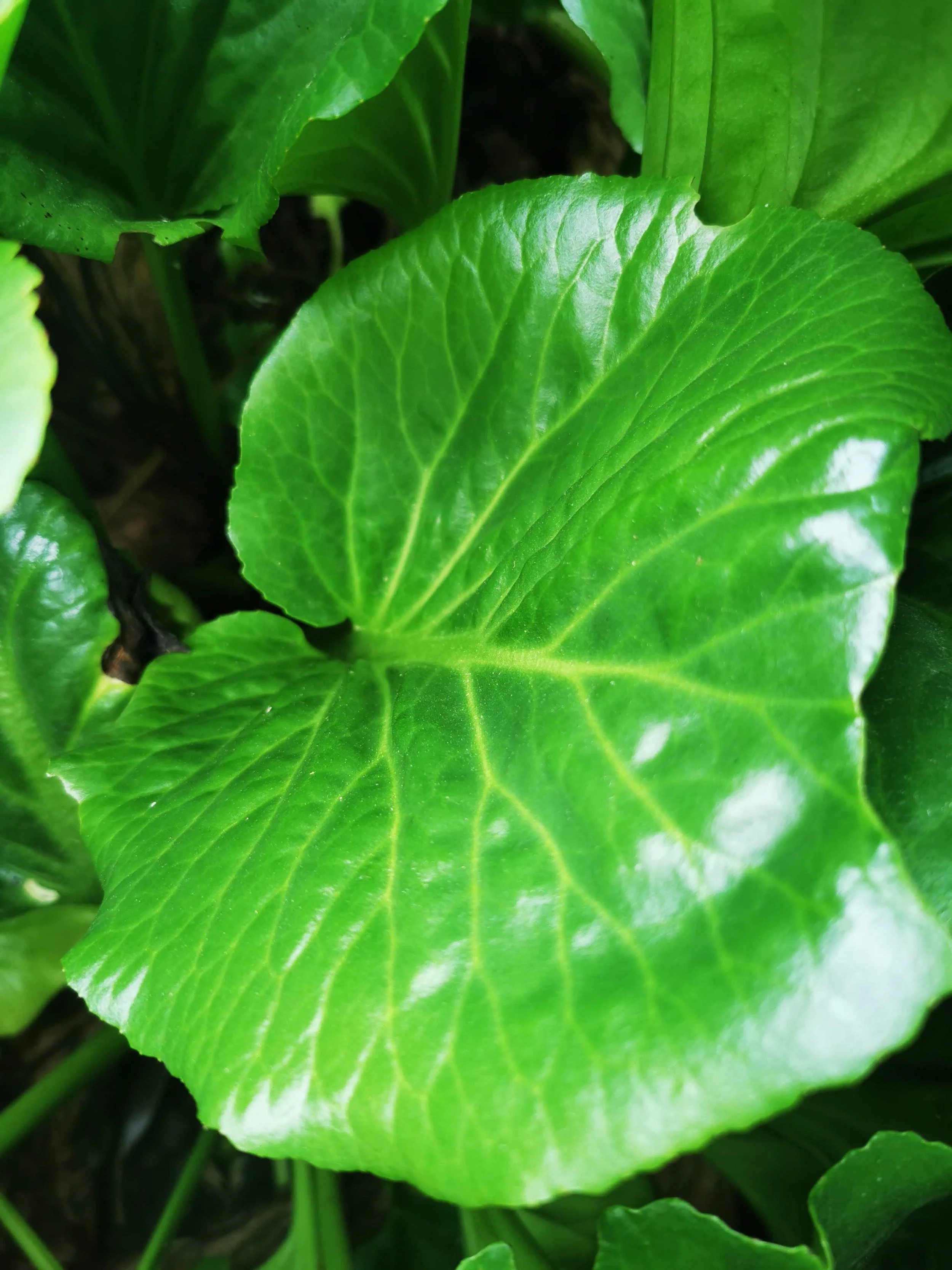 Found growing in the order beds at Oxford Botanic Garden, the species name is likely to have been misapplied. Sadly, there is no information on when the plant was accessioned into the collection, pre-dating 1940 when many plant records were lost. It has large, upright, rounded, dark green leaves with a wavy-edged margin, reminiscent of B. cordifolia. Flowers are yet to be observed.