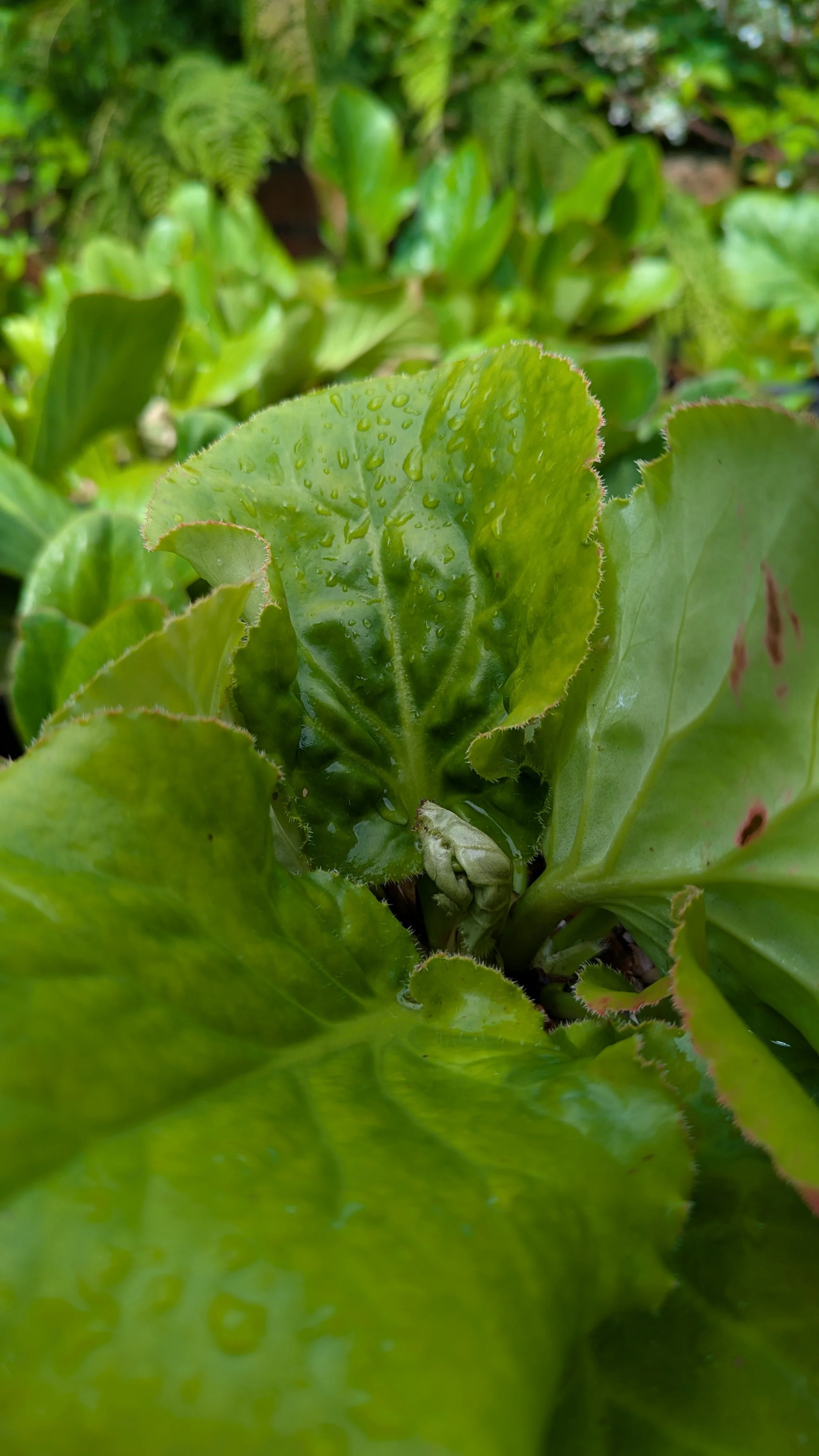 A named variety discovered for sale from Atelier du Vegetal in France. It has good sized, round, leathery, dark green leaves with a coarsely ciliate wavy edged margin. Leaf surface is glabrous with hairless petioles. Slow growing and generally low growing with some yellow-red leaf colour in autumn. In spring, attractive white flowers blushed pink open atop short branching stems. Likely to be a selection of B. pacumbis.